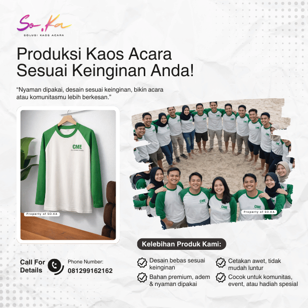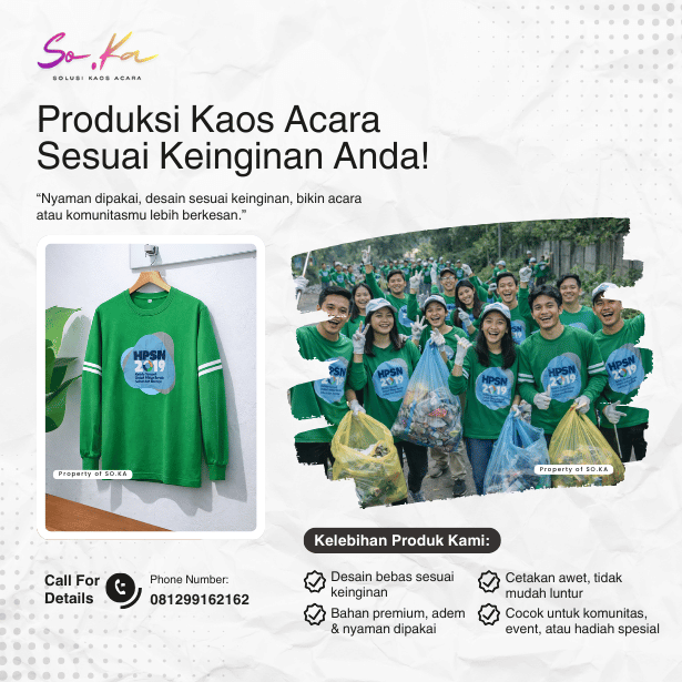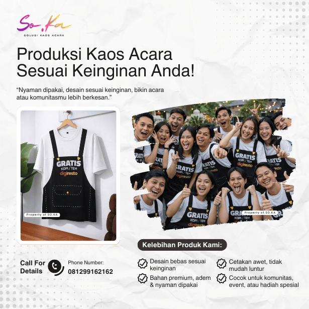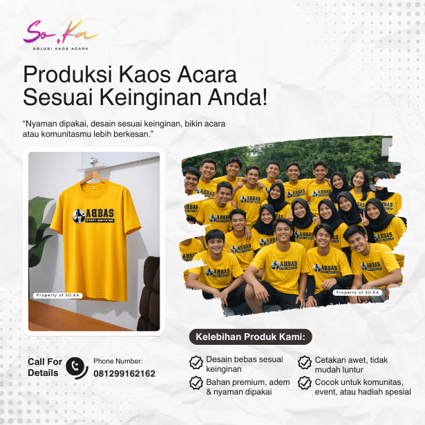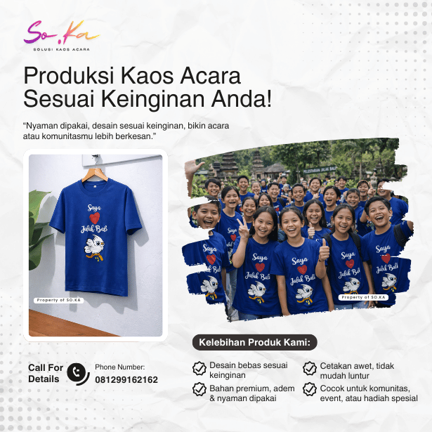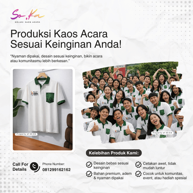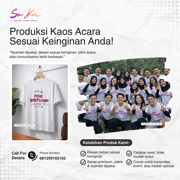 Hubungi tim SO.KA melalui WhatsApp. Sampaikan detail acara, jumlah kaos, jenis bahan, warna, dan konsep desain yang diinginkan. Tim kami akan membantu memberikan rekomendasi terbaik.