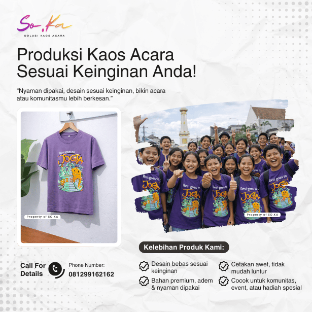 “Pelayanan SO.KA sangat responsif dan hasil kaosnya sesuai ekspektasi. Bahannya nyaman dipakai seharian dan hasil sablonnya rapi. Acara kami jadi terlihat lebih profesional.”